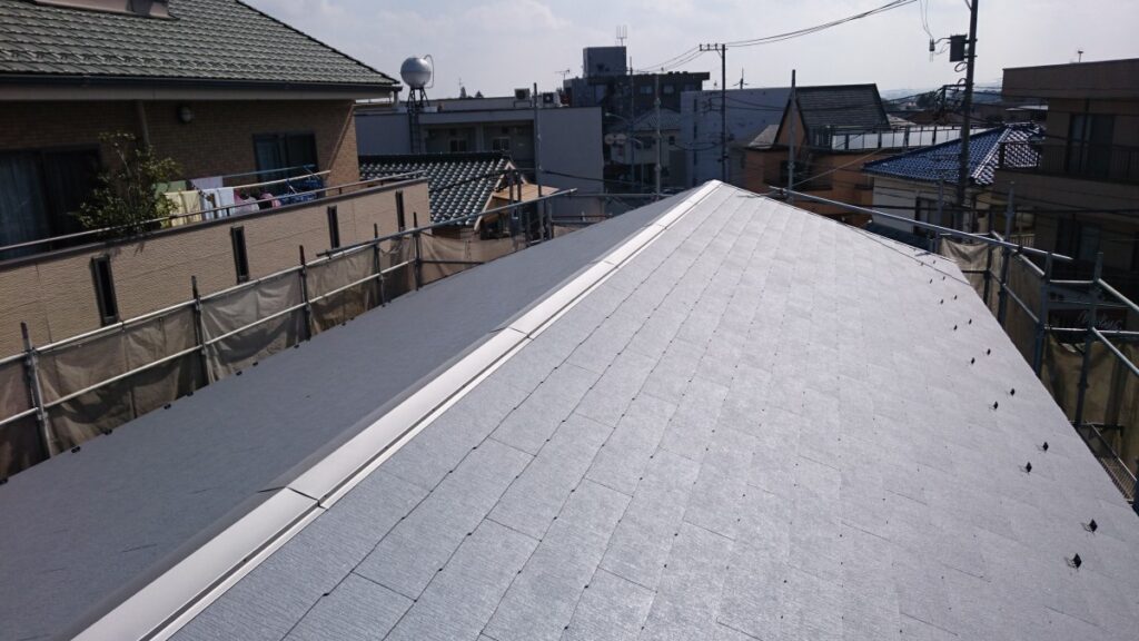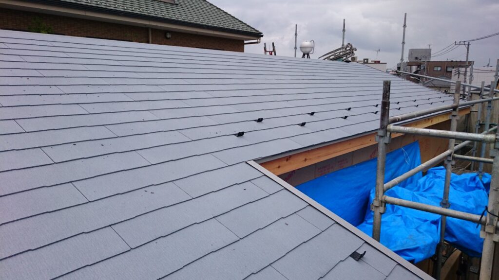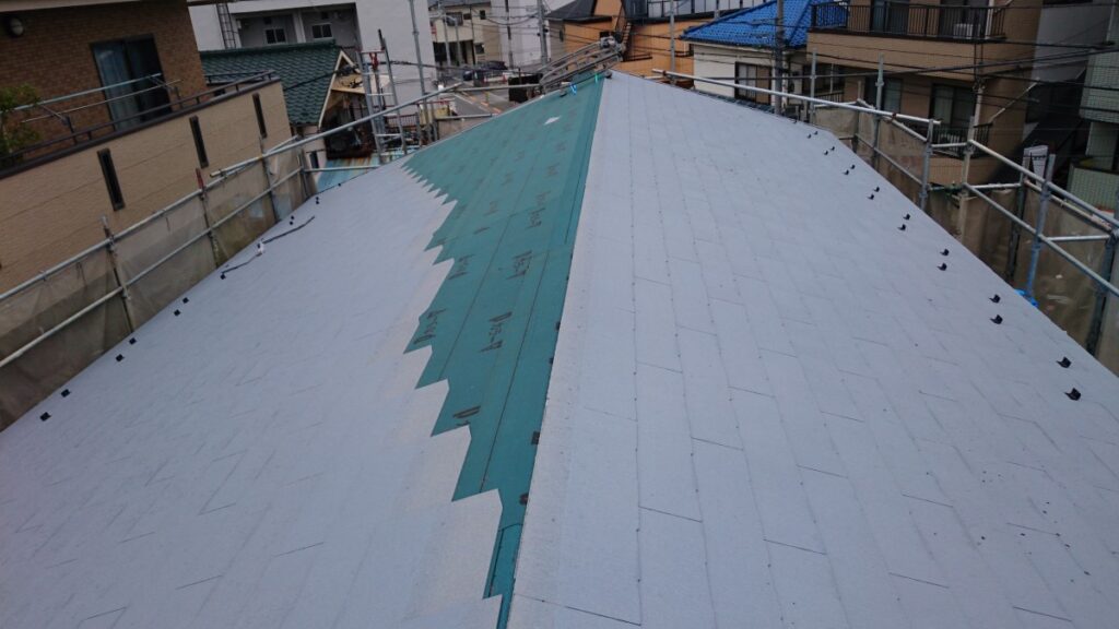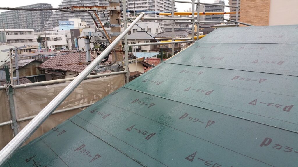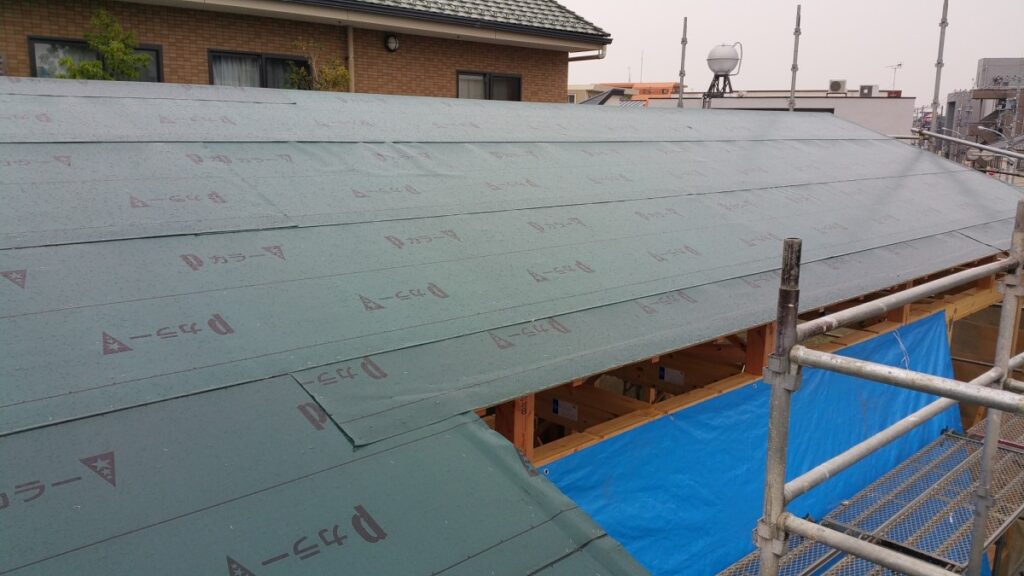 屋根材を葺くまでは完璧な防水とまではいきませんが、アスファルトルーフィング施工後はかなりの確率で雨水の浸入を防ぐことができます。