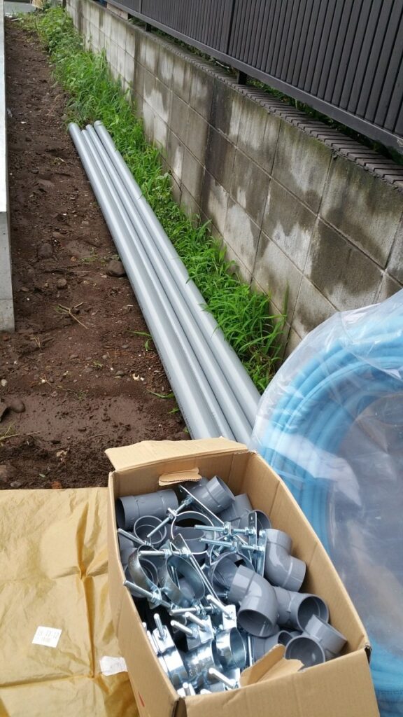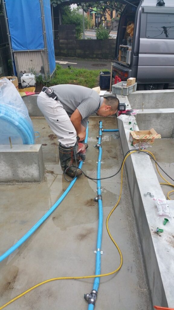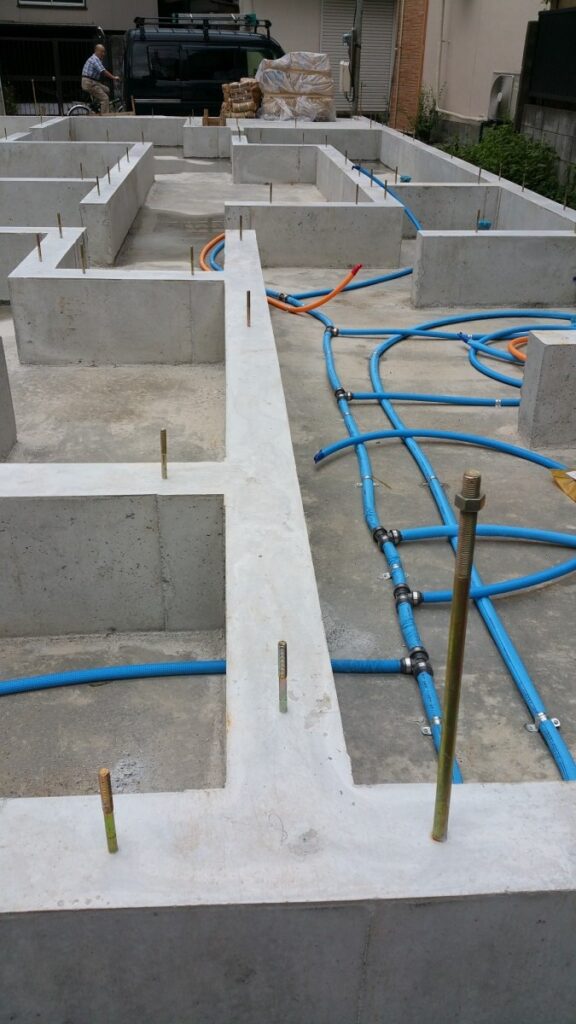 最近は雨が続き工事現場もなかなか進まない今日この頃です。 台風の影響が深刻です。皆さまは大丈夫でしょうか?御無事であられることを心より願っております。 さて、昭島市昭和町木造耐火建築新築工事現場では基礎工事が完了しました。基礎工事が終わりますといよいよ大工工事が始まります。 その前に『雨にも負けず・・・。』工事をしてくれている業者さんがいます。 設備業者さんです。 設備業者とは所謂『水道屋さん』です。 水回りの工事を行ってくれます。