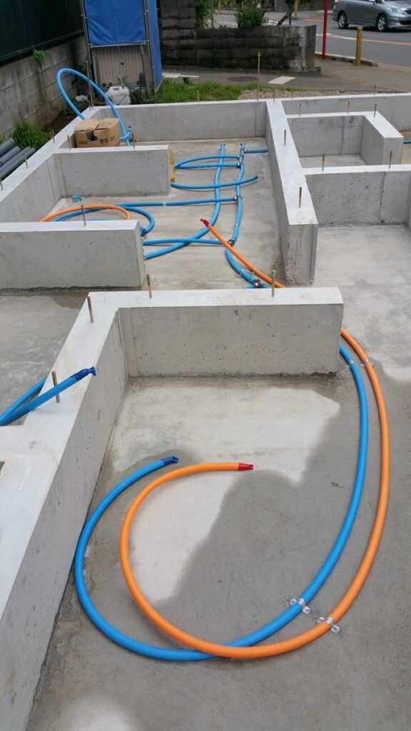 ただ床下に配管を這わせるだけで終わらせる業者さんが多いですが、弊社の設備屋さんは配管が美しく見えるようサドル(≒ホースバンド)を用いて、基礎耐圧盤にしっかり固定してくれています。