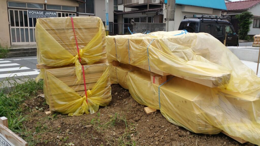 そして現場にはついに材木が搬入されて参りました。