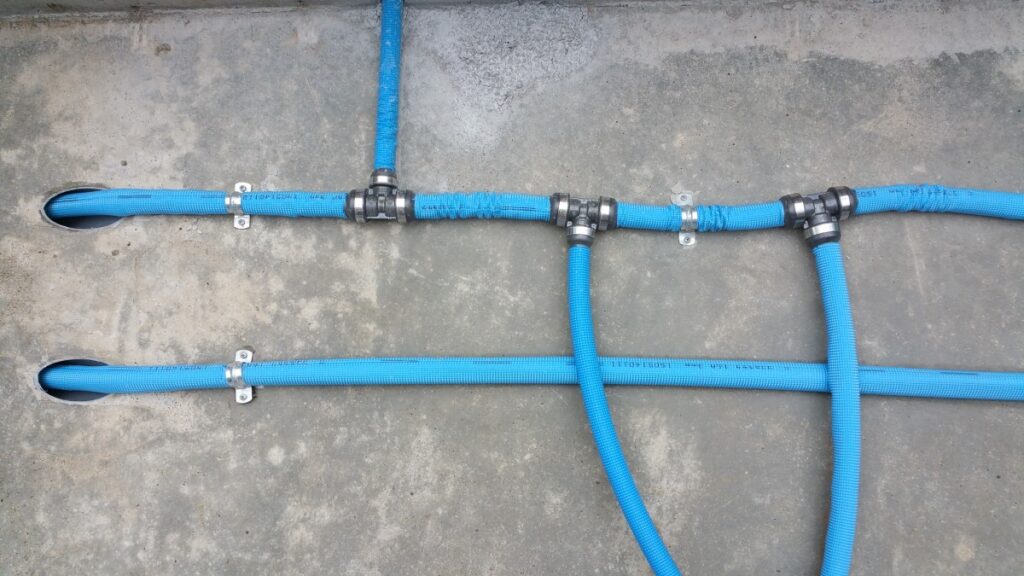 昔と違い、メッキされた鉄管でも濃い青色の塩ビ管でもなく、水色をした『架橋ポリエチレン管』を使用します。