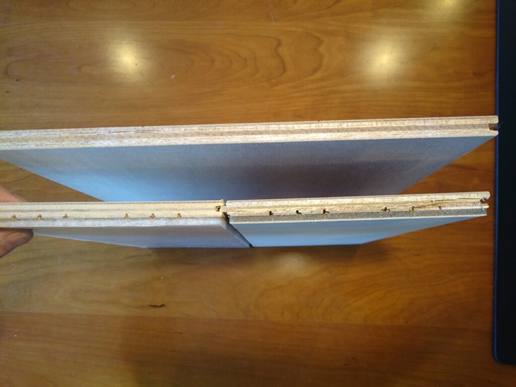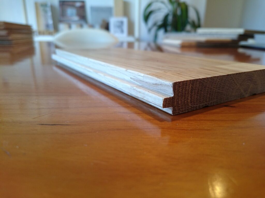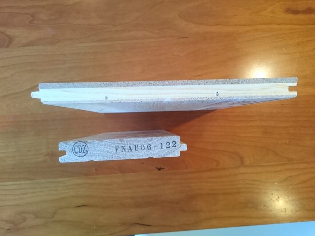 写真の下の物が『直貼りフローリング』です。大きな違いとしてはフローリングの裏にゴムやスポンジのような材料が貼り付けあります。厚みは13.8㎜程度。