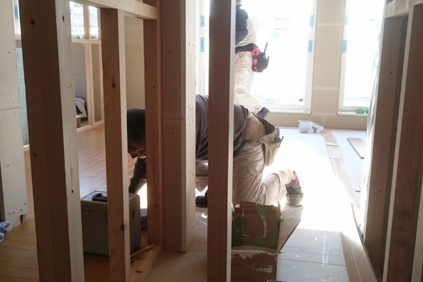 昭島市昭和町木造耐火建築新築工事現場では、造作工事の真っ最中です。 間仕切り工事がほぼ終了し、フローリング工事に入りました。 お引渡しに向け、造作工事も順調に進んでおります。 今後、床ができ壁が張られ、日に日に住宅らしさが増していく現場です。