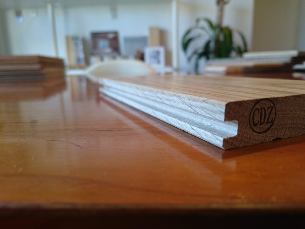 現在、一般的に『フローリング』と呼ばれる材料です。合板を基材とし、銘木を薄く剥いだ材料(突板若しくは挽板)を接着し床材として使用しています。