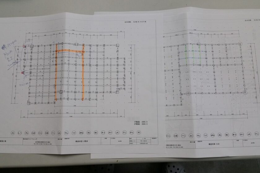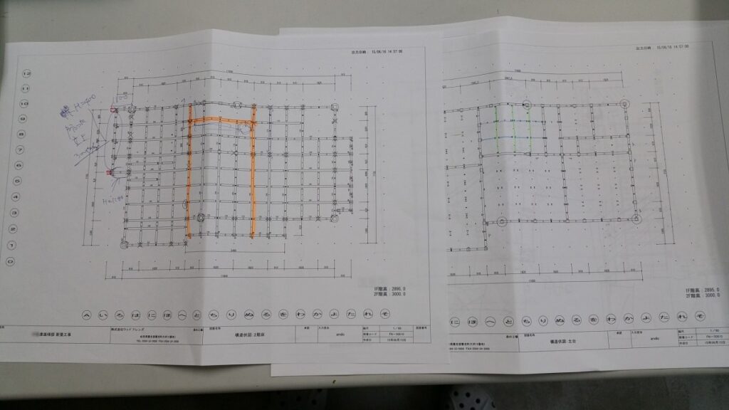 プレカット業者さんとの打ち合わせにより、梁のかけ方、梁成などを決定していきます。特に今回の木造耐火建築の場合この作業は非常に大切です。一人でチエックしていると見落としがあったりする可能性があるので、数人で検討、チエックをしています。