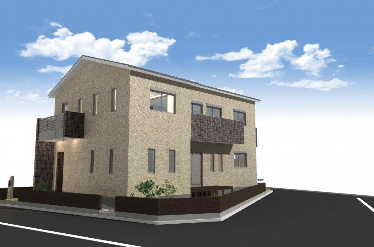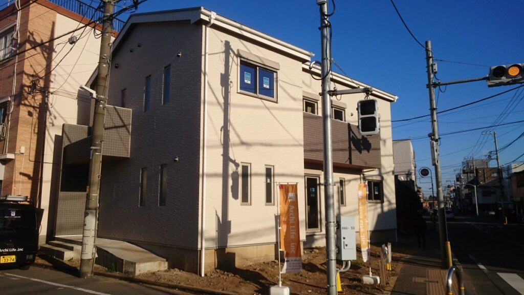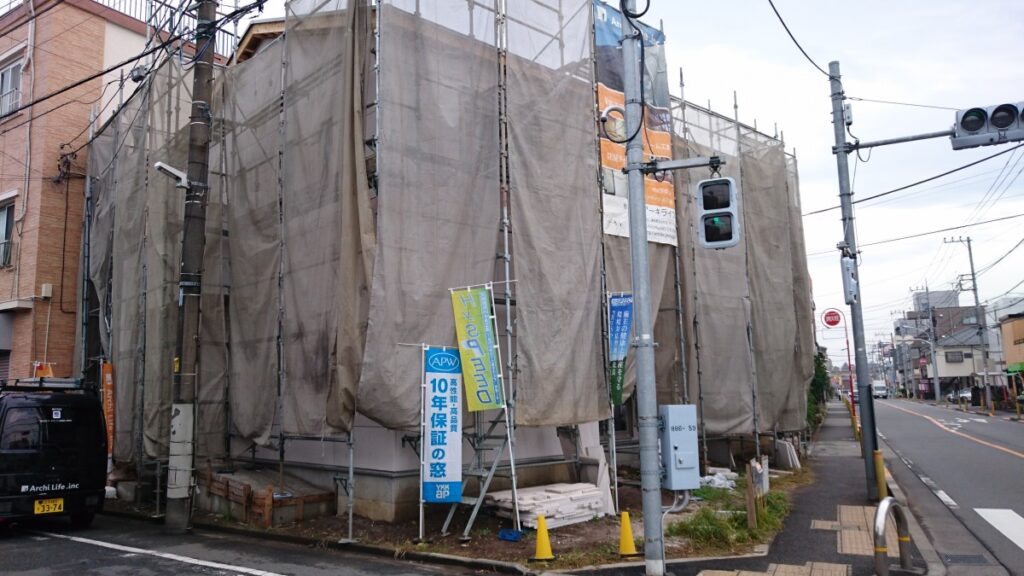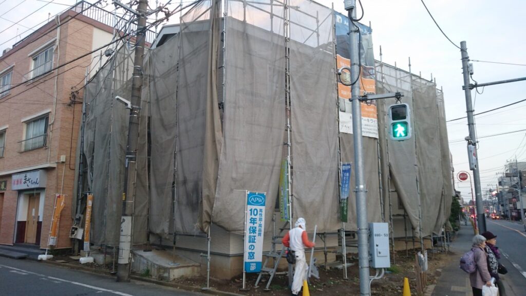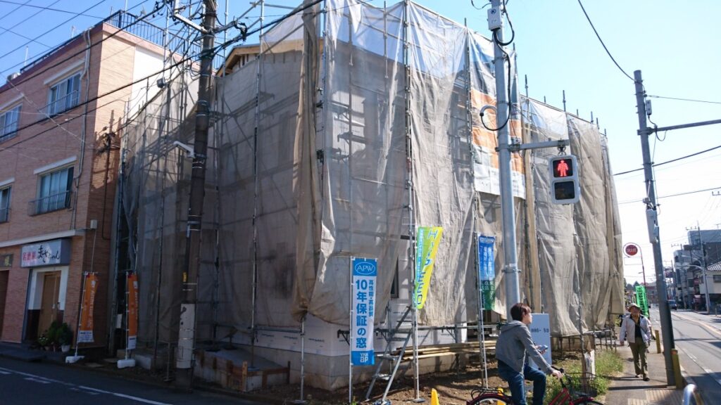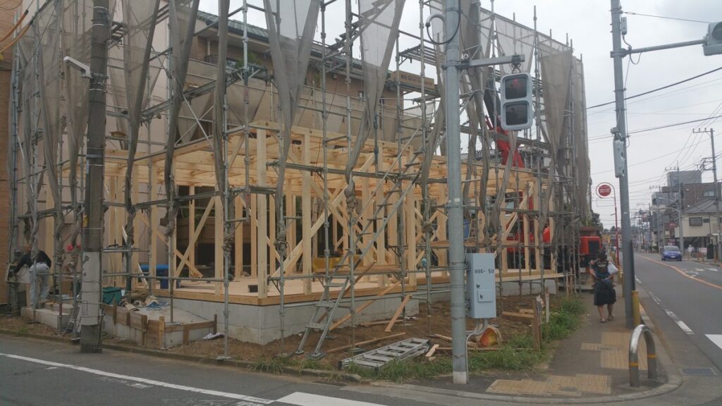 昭島市昭和町で工事を承っております木造耐火建築新築工事現場では、遂に仮設足場を取り払いました。 全貌が露わになった木造耐火建築。