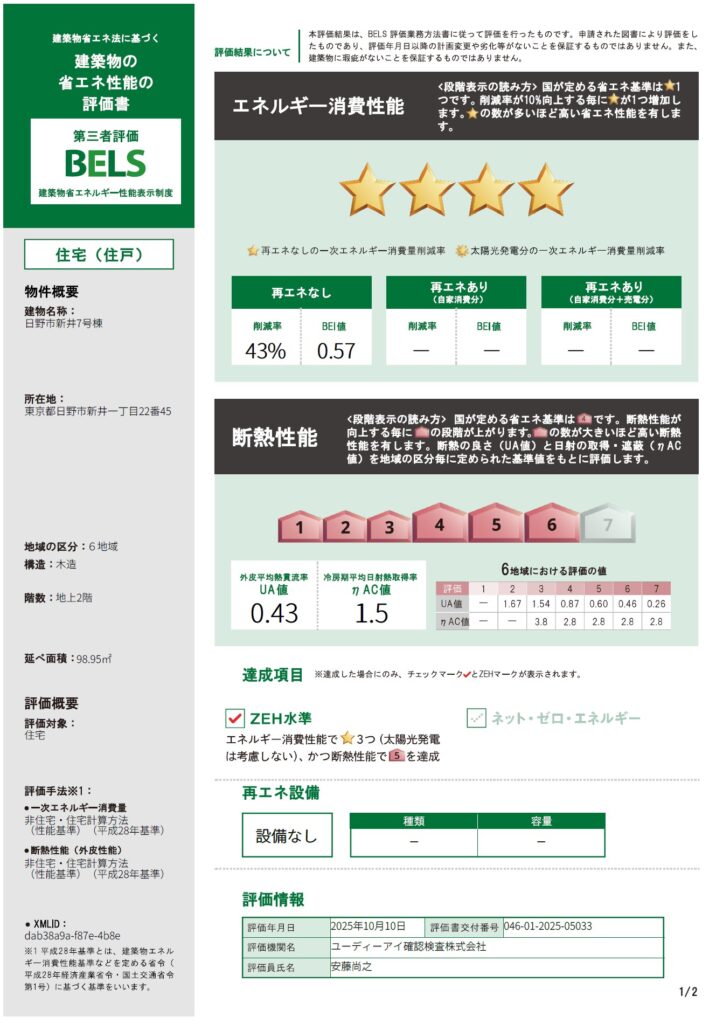 弊社のドムス(=Domus)シリーズは全棟BELS評価を受けております。今回の日野市新井7号棟は