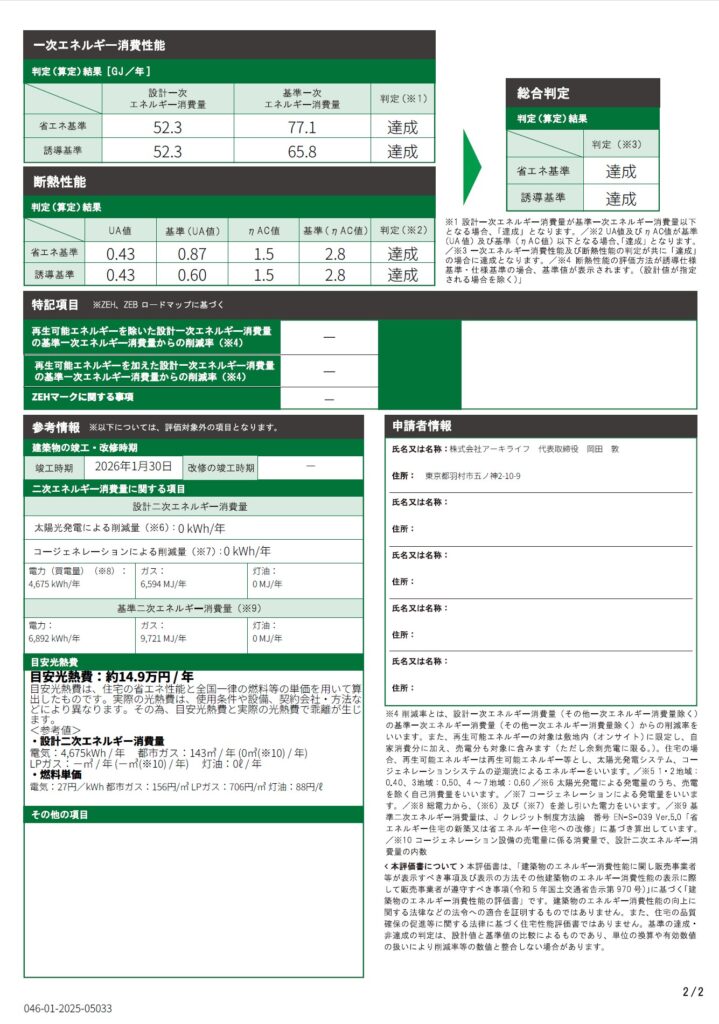 断熱性能を表すUA値は0.43W/(㎡・K)で断熱等級6(東京などの6地域では0.46以下で断熱等級6)