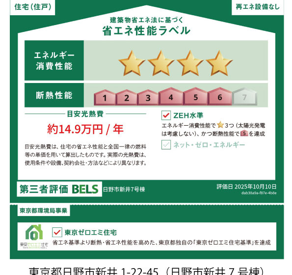 弊社のドムス(=Domus)シリーズは全棟BELS評価を受けております。今回の日野市新井7号棟は