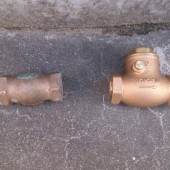 今回悪さをしていたのはコイツ。チャッキ弁と呼ばれる「逆止弁」です。逆止弁は水の逆流を防ぐ為に設置されます。このチャッキ弁が経年劣化し中のゴム製のバルブが硬化して動かなくなっていました。