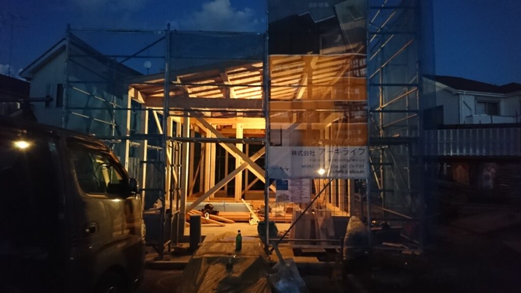 日が落ち一段と寒さがまし、一日かけての上棟、無事に終了いたしました。