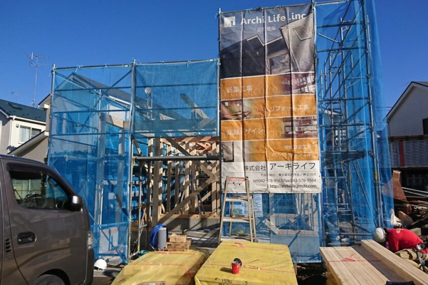 晴天の下、福生市大字福生では新築工事が開始し、朝から上棟が行われました。