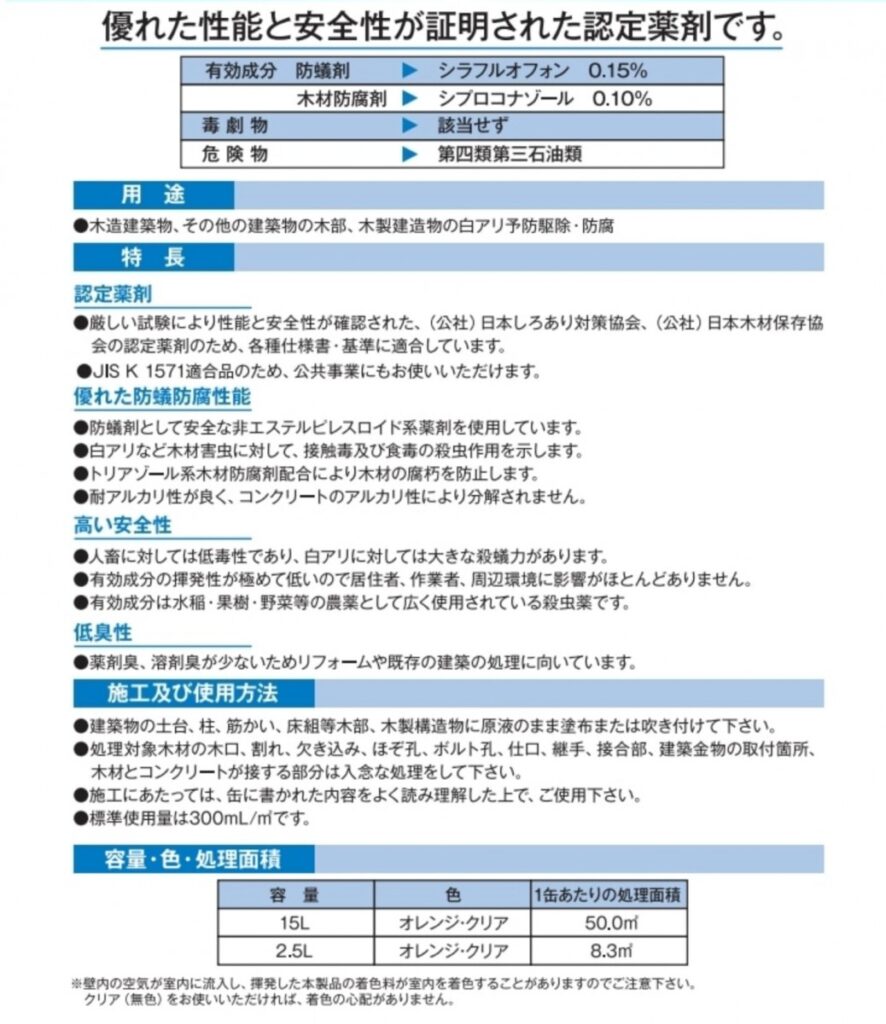 上の写真は一般的な防腐防蟻材の仕様書となります。敢えて商品名は出しませんが、一般品とは違い高価な商品です。