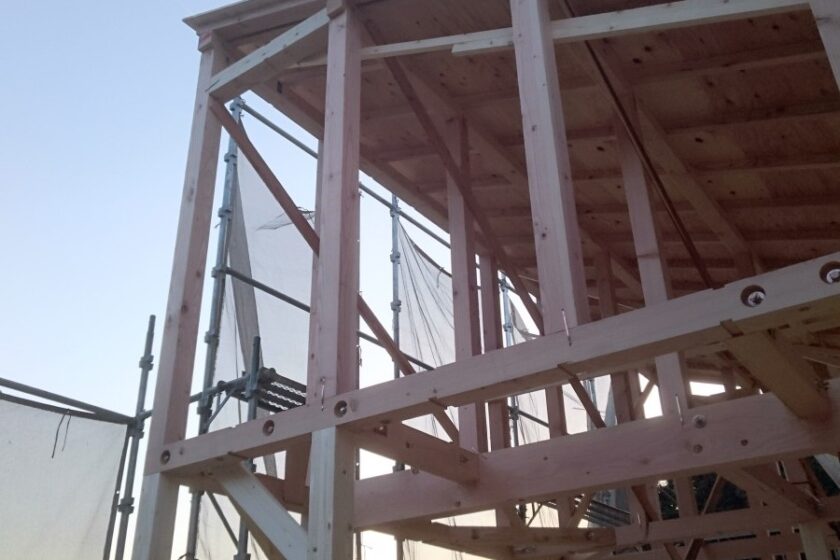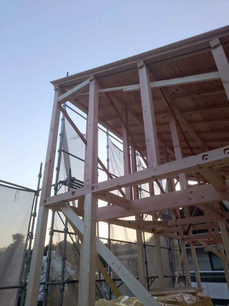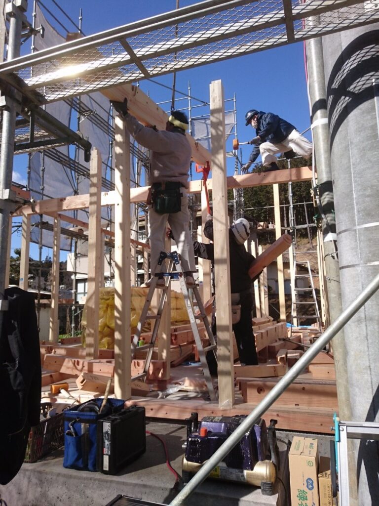 無駄のない動きで午前中に一階と二階の柱が立ち上がりました。