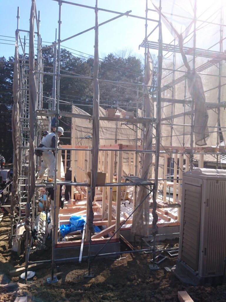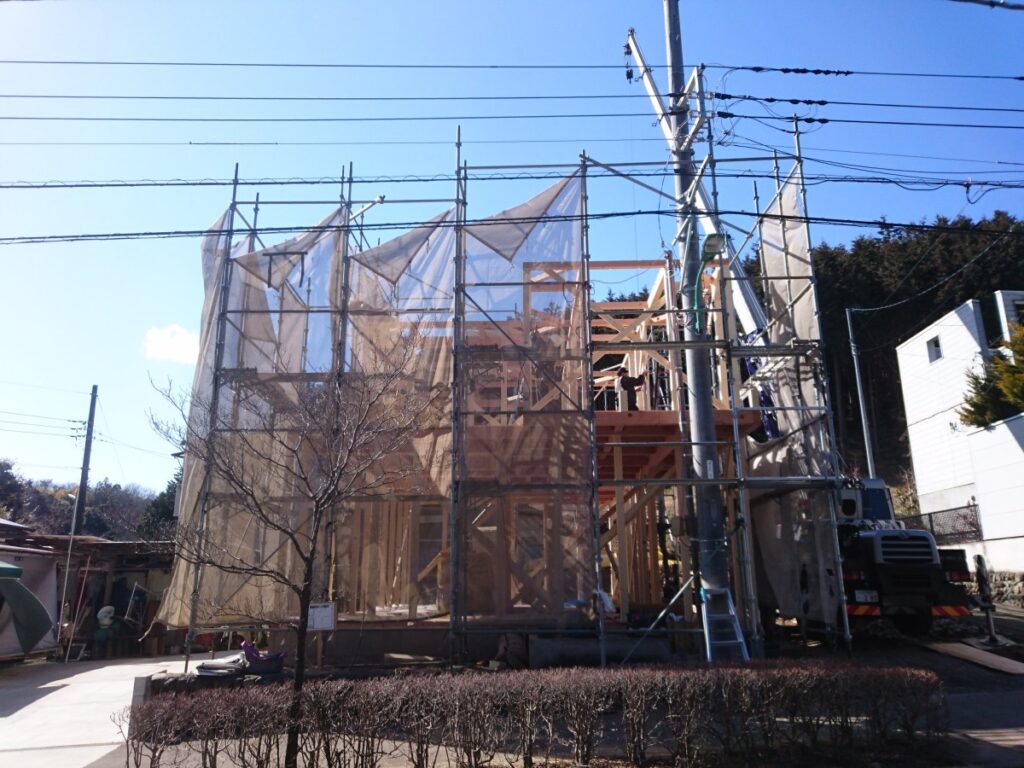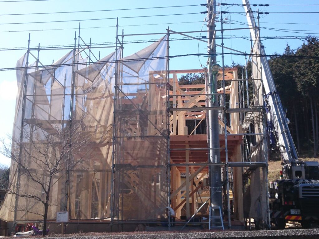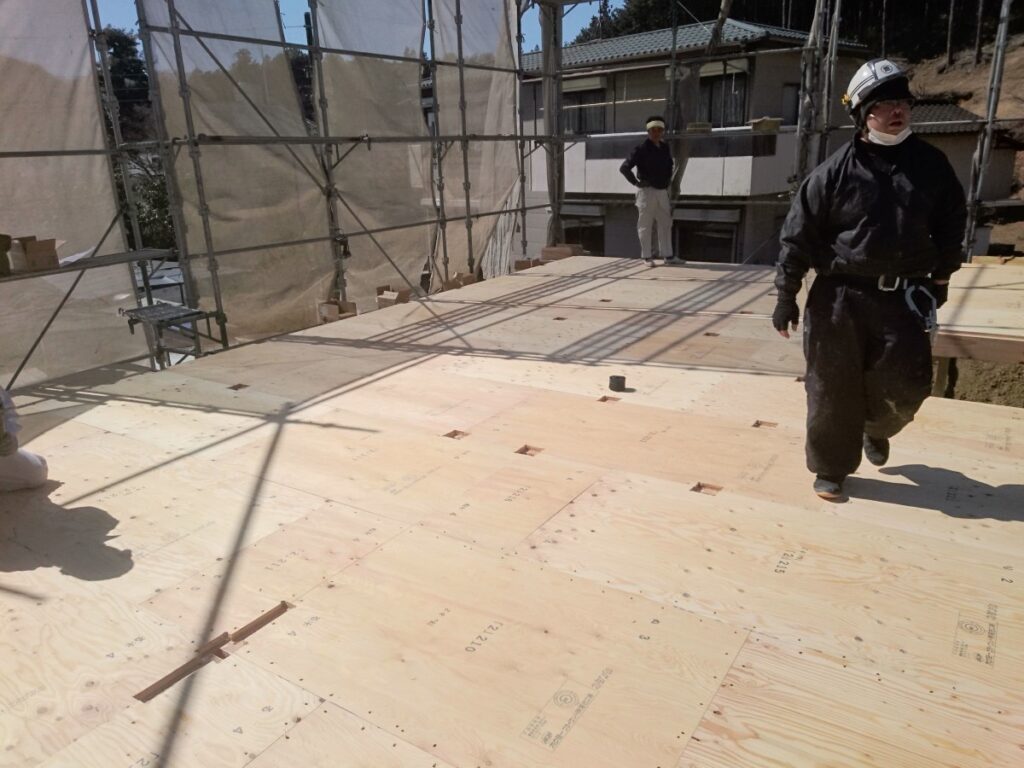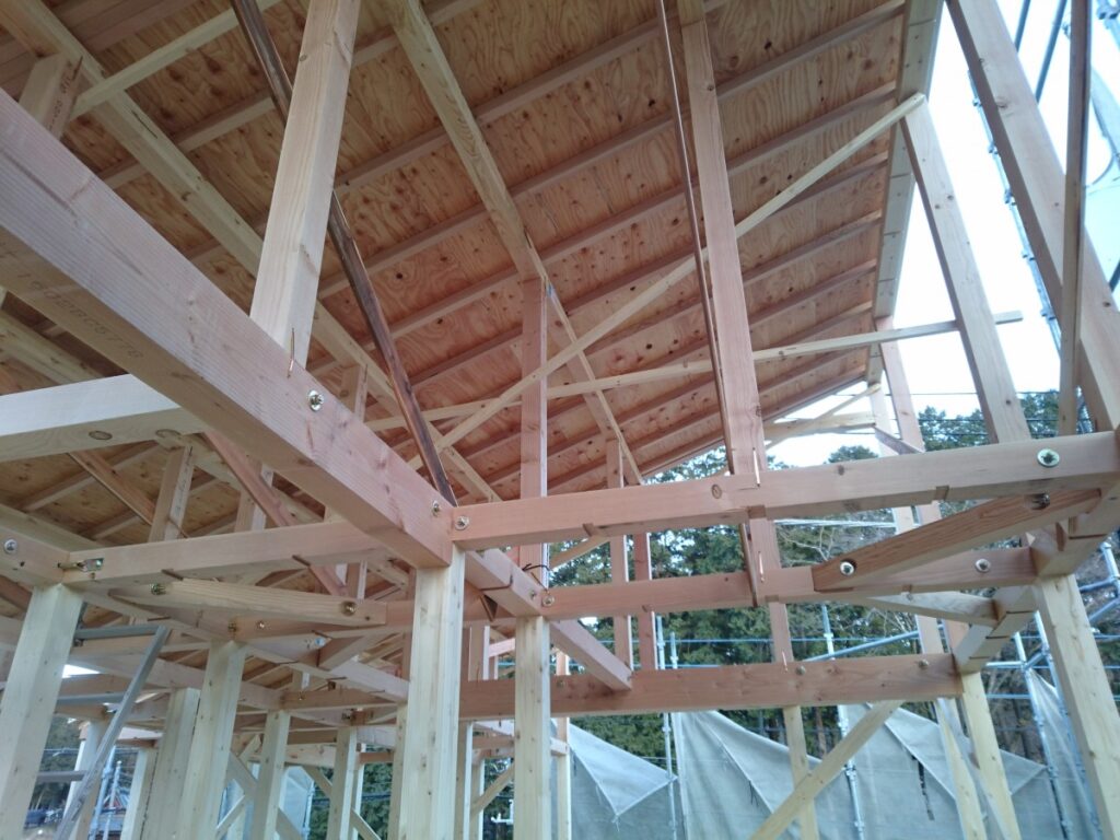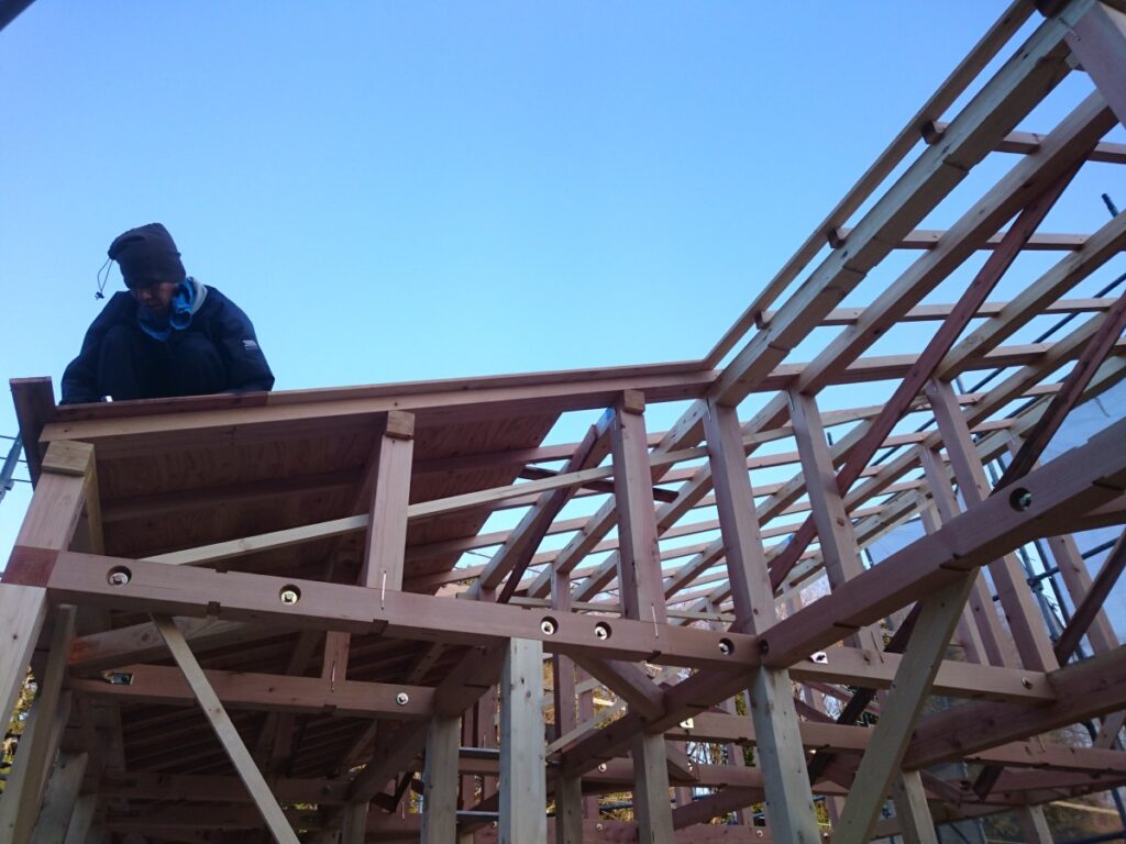柱を建て、梁を掛け、小屋束、母屋、垂木そして野地板。