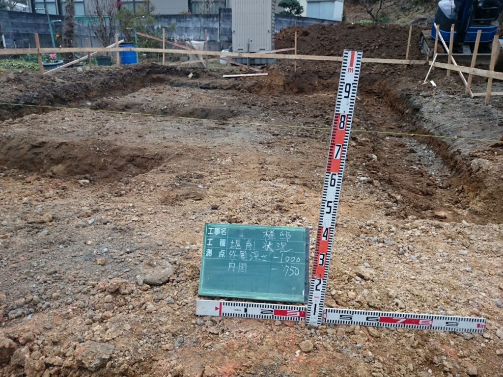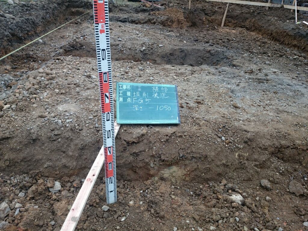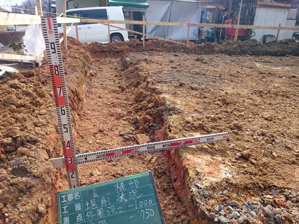 青梅市根ヶ布で工事中の新築もついに本格的な建築工事に入って参りました。 地盤改良工事を行い足元を固めたところで、次は基礎工事です。 建築物は地面の上に、ポンっと置かれている訳ではありません。地面を掘って少し地中に埋めるイメージです。一般的には『根入れ』といいます。 これは『根入れ効果』や『Df効果』といわれる建物にたいする地盤の支持力を上げる効果があるとされています。(この件は、専門的すぎるので割愛します。) そこで基礎外周部及び地中梁部分を掘っていきます。