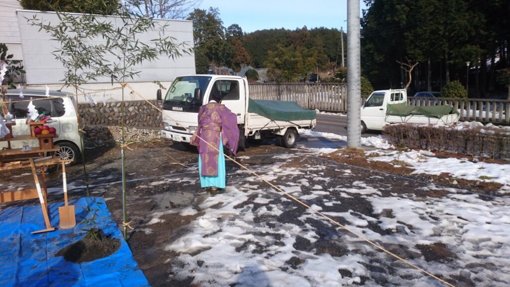 青梅市根ヶ布にてH様邸の新築工事を着工させていただくことになりました。 着工にあたり、お施主様のご威光により地鎮祭を執り行っていただくこととなりました。 地鎮祭を執り行うにあたり建築する土地に、地縄を張りどの位置に建築するかを記します。 その地縄の中に、神主様が祭壇を築き地鎮祭を行います。 この土地は90坪を超える広大な土地の為、地縄が重要となります。