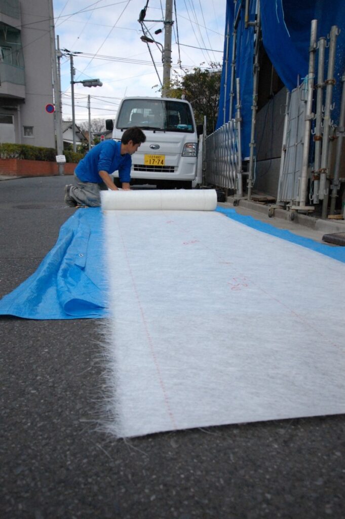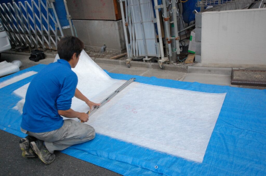 グラスウール(ガラス繊維シート)を敷き詰めてその上に下塗り塗料、