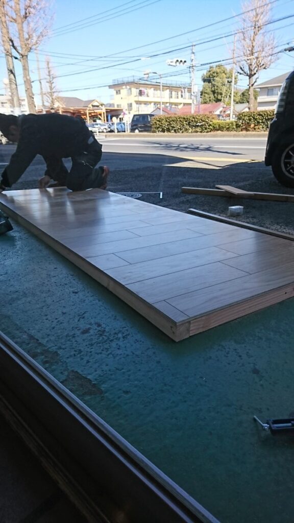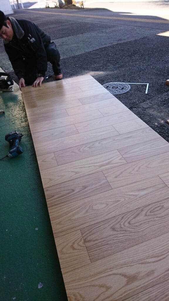 現在建築中の現場で先日フローリング工事が完了しました。この現場で使用されたフローリングはまずまずのグレードの商品でした。フォローリングは大抵1坪単位で購入します。ですので、あと少し足りないという場合でも、もれなく1坪買わなければならないのです。半分以上捨てることとなっていたこのフローリングを再利用しようと現場から持ち帰りました。